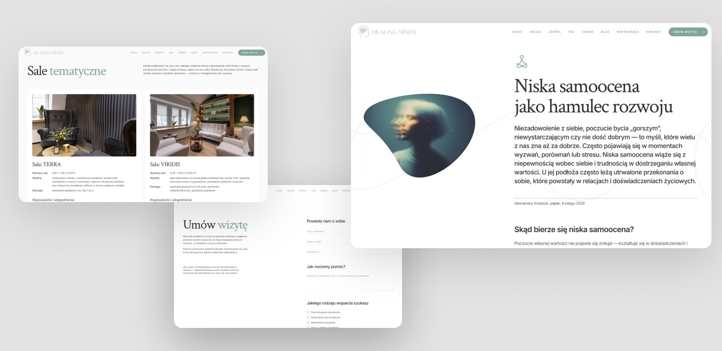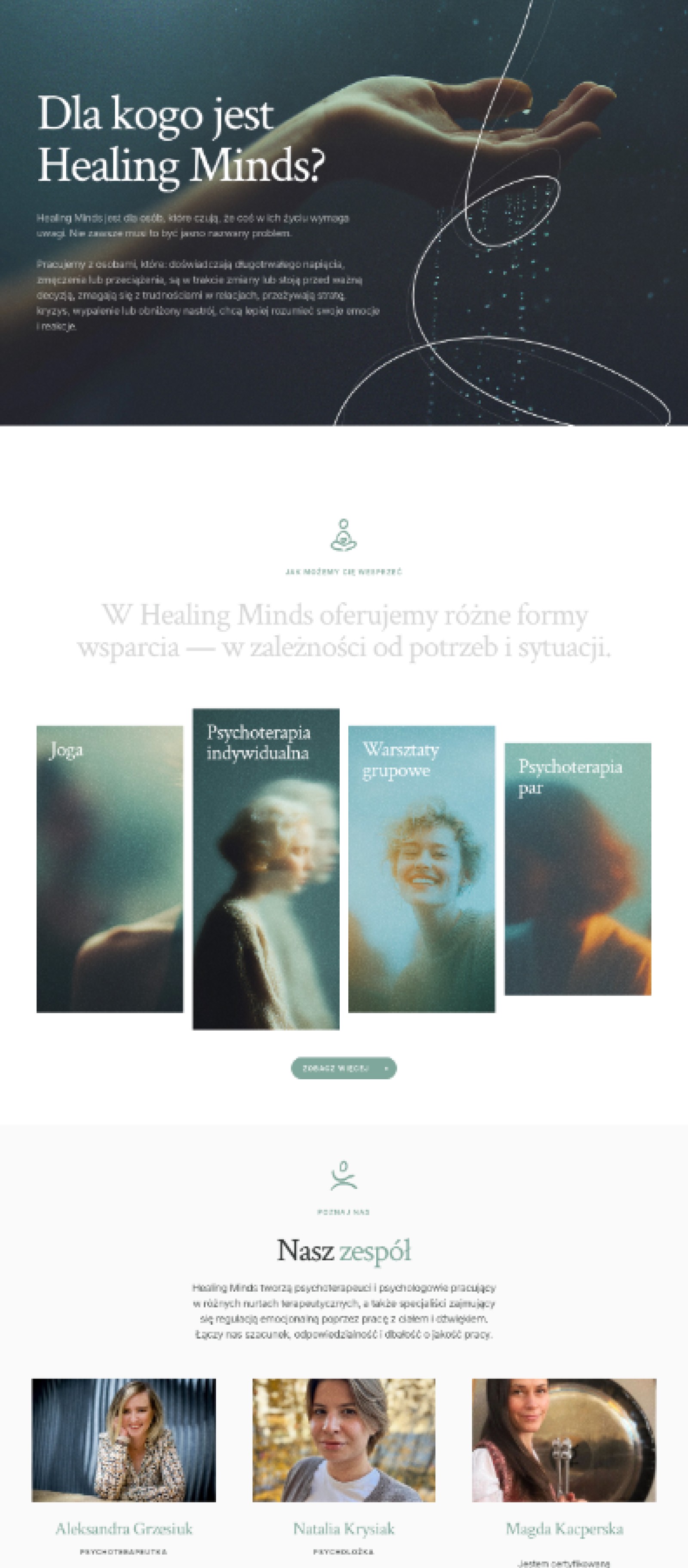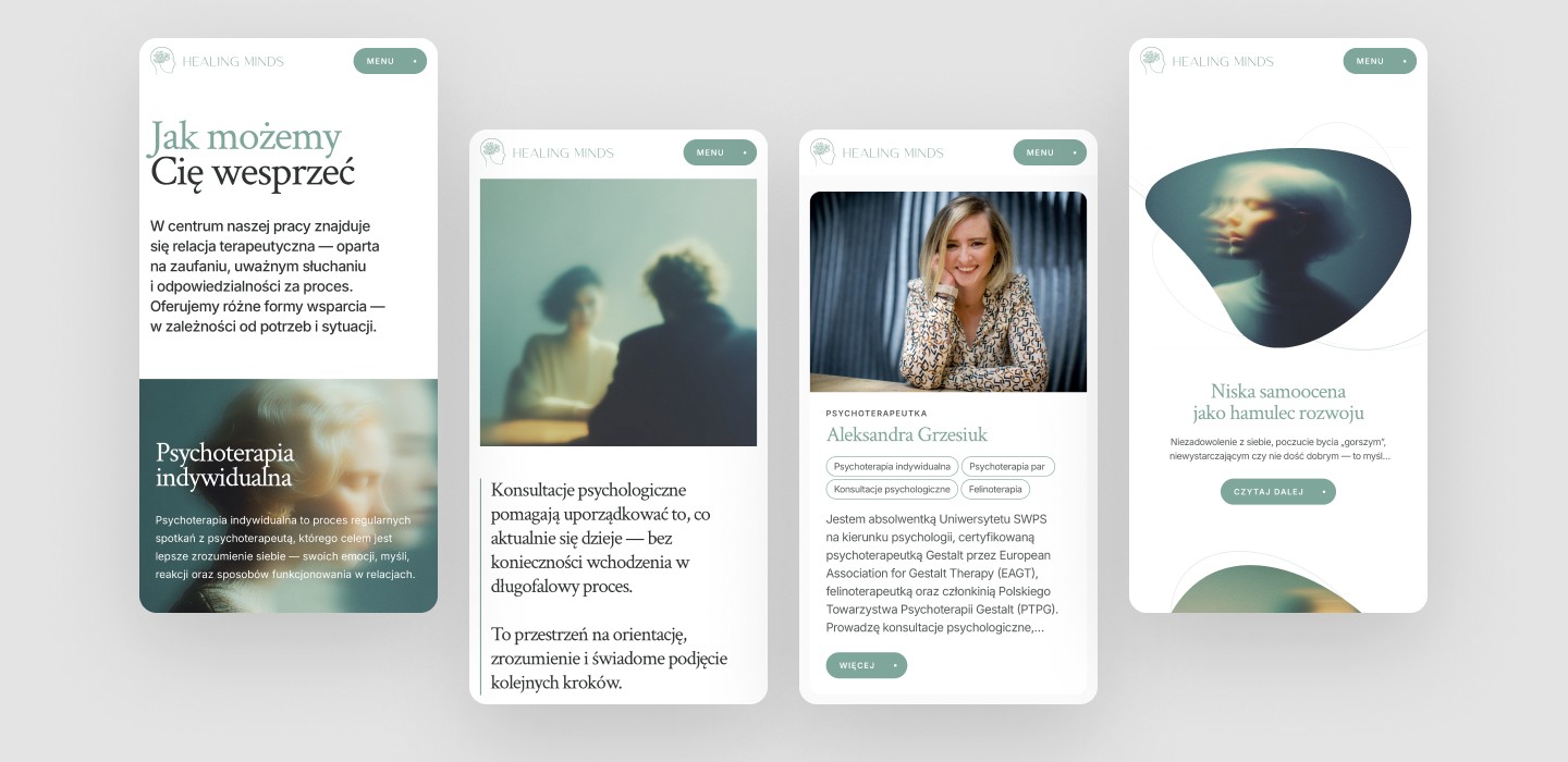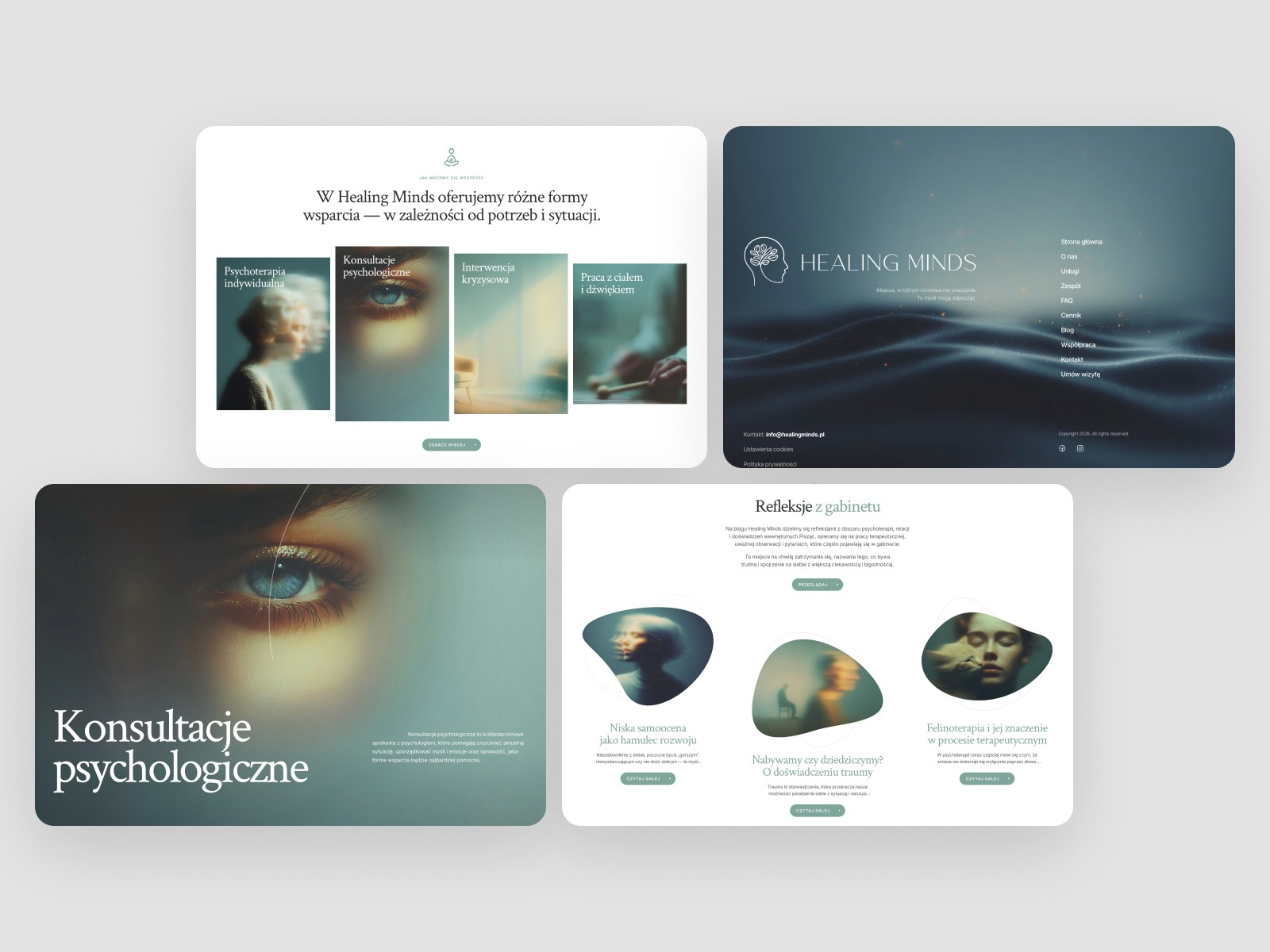 Healing Minds offers a wide range of psychology and psychotherapeutic services, addressing sensitive and deeply personal topics. The goal was to move beyond the typical clinical, minimal, “white-and-blue” therapy website and instead create something visually expressive, warm, and distinctive — while maintaining clarity, trust, and accessibility.