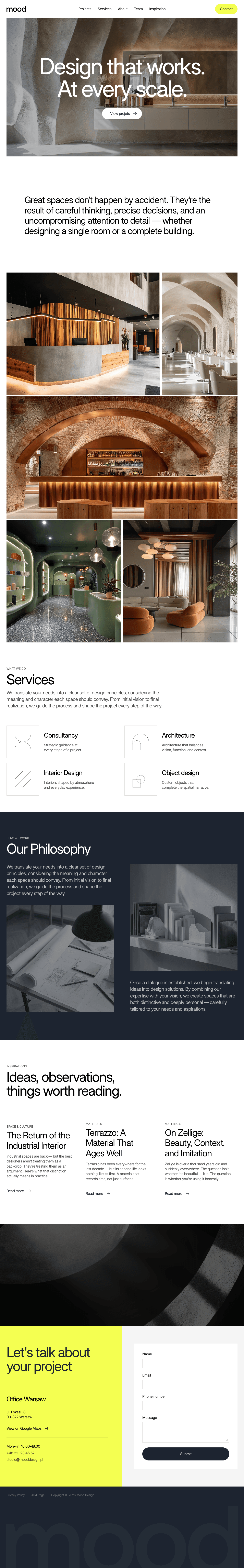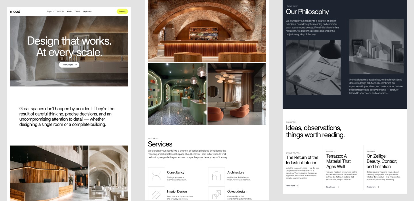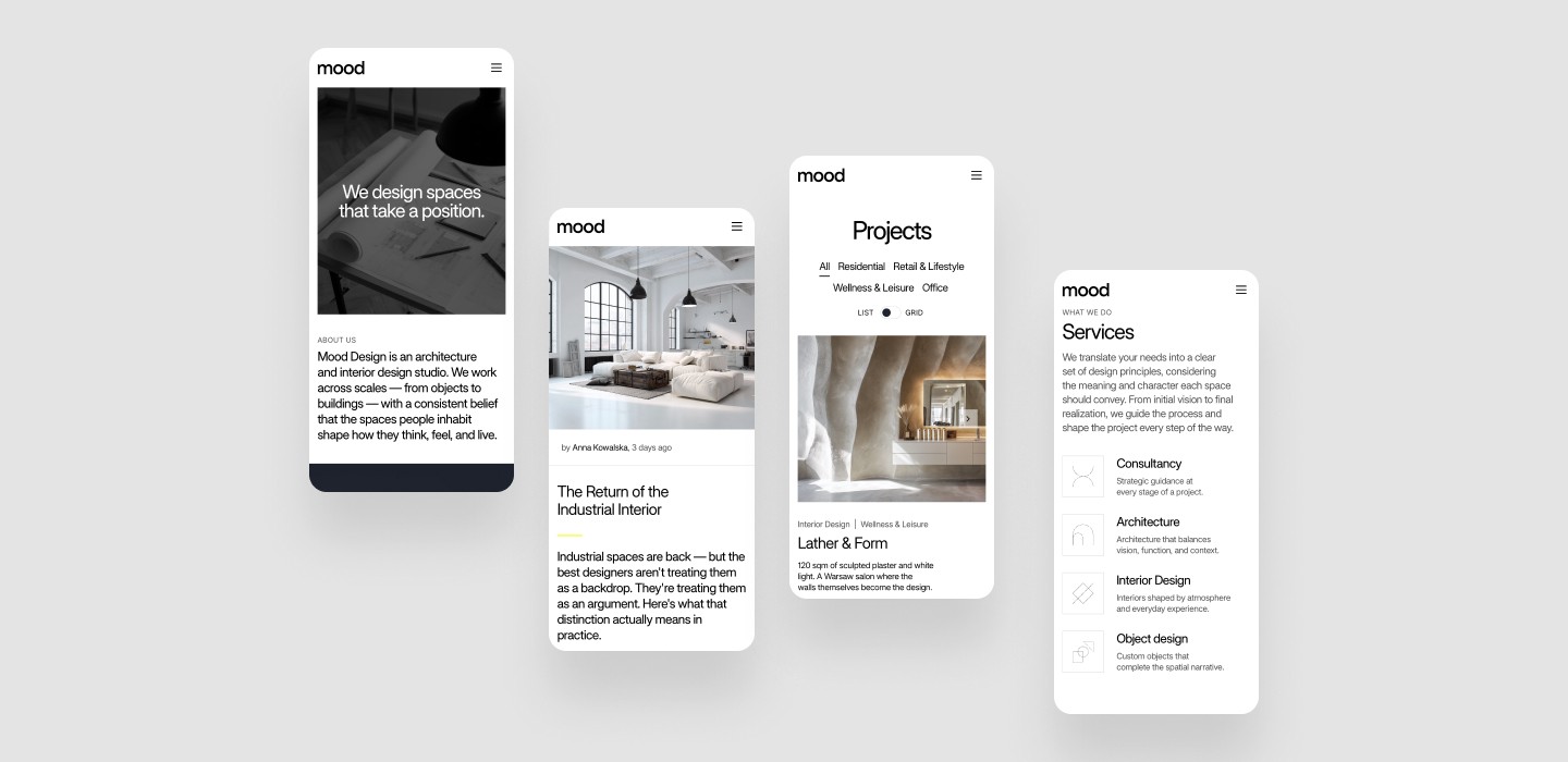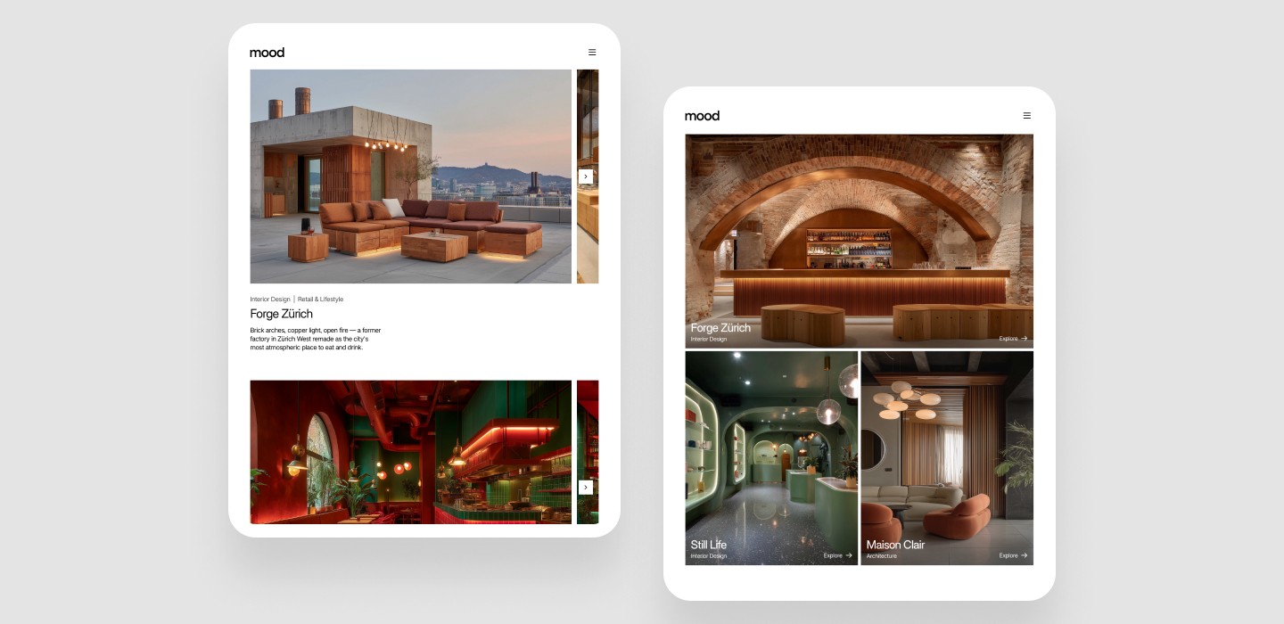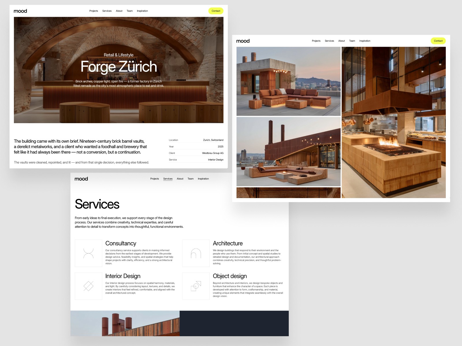 Mood Design focuses on showcasing projects in the most effective way possible. The design feels calm and understated at first glance — but behind that simplicity is a powerful layout system designed specifically for visual storytelling. Large full-width grids, immersive project pages, and flexible gallery layouts allow images to take center stage.P rojects use large full-width masonry galleries that create a natural visual flow, making it easy for visitors to explore your work. Images scale beautifully across screen sizes and maintain strong visual rhythm throughout the site.